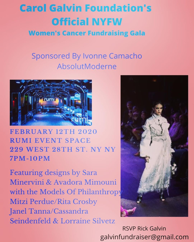 February 12th @rumieventspace The @carolgalvin_foundation returns to @nyfw for its bi-annual women’s cancer fundraising gala. Featuring the designs by @avadoramimouni with models of philanthropy such as @janeltanna @lorrainecsilvetz @cassandraseidenfeld Rita Crosby & Mitzi Perdue walking for her along with many more to be announced. Sponsored by @absolutmoderne Join us and help those battling cancer so they can pay their bills. #nyfw #carolgalvinfoundation #absolutmoderne #janeltanna #lorrainecsilvetz #cassandraseidenfeld #avadoramimouni #fashion #rumieventspace #womenscancer #support